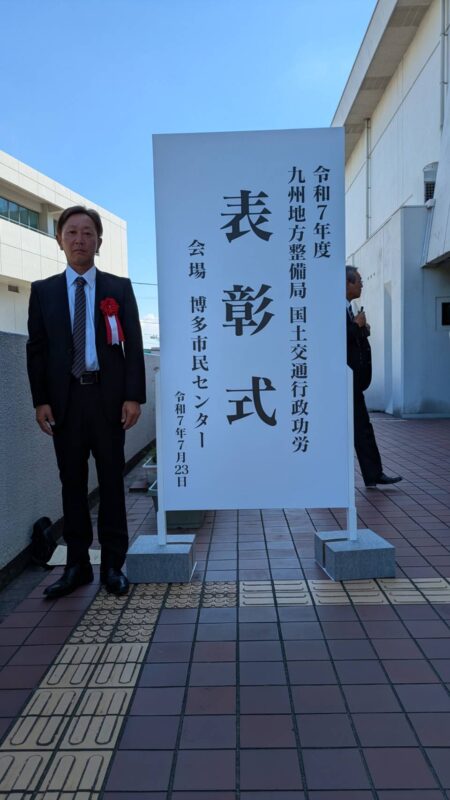 令和7年度 九州地方整備局 国土交通行政功労表彰式にて、優秀建設現場従事者(優秀施工者) を受賞いたしました。